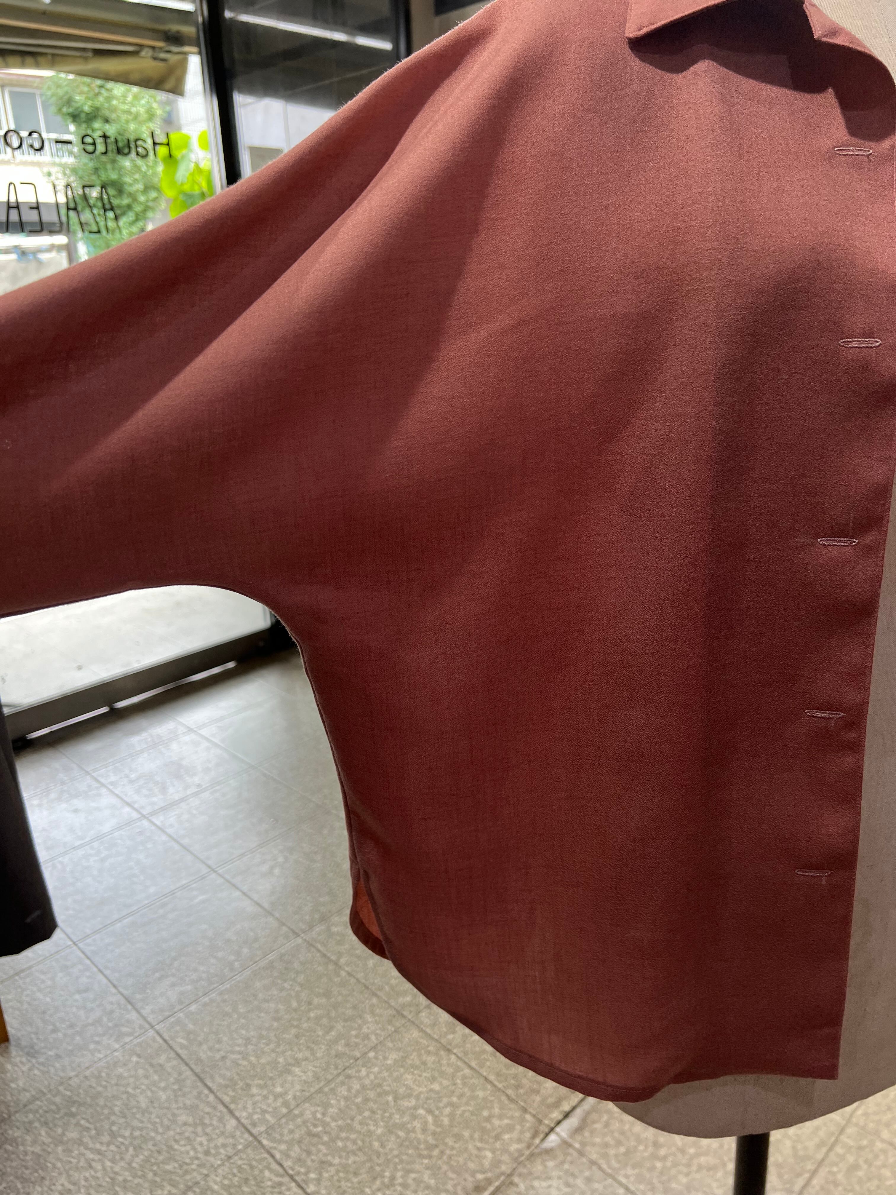 ウールジョーゼットのドルマンスリーブのブラウスです。秋にインナーを着て上に羽織っていただくイメージです。